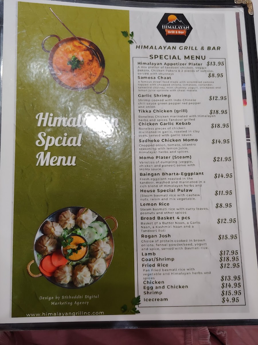 Welcome to Himalayan Grill & Bar, a culinary gem nestled in Cary, NC, where the flavors of Indo-Nepalese cuisine come alive. The menu is a vibrant tapestry featuring aromatic curries, grilled meats, and authentic Nepalese street food. Standouts include the Chicken Tikka Masala, rich with creamy goodness, and the goat sekuwa, offering a smoky delight. Don't miss their unique MoMo dumplings, served with a tantalizing Indo-Chinese sauce, and the comforting Thukpa noodle bowls.